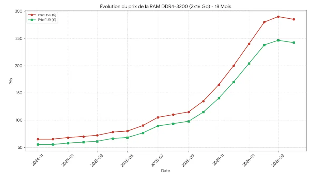 Entre novembre 2024 et avril 2026, le prix du kit DDR4-3200 2×16 Go est passé de 55,25 € à un sommet de 246,50 € en mars 2026, avant une stabilisation précaire. Cette trajectoire n’est pas un simple ajustement de marché, mais le résultat d’un abandon programmé des lignes de production grand public par les géants du secteur.