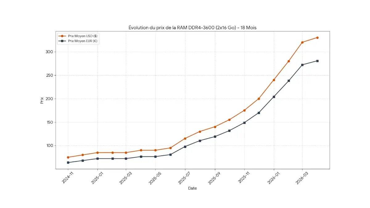 Entre novembre 2024 et avril 2026, le prix du kit DDR4-3600 2×16 Go est passé de 63,75 € à un sommet historique de 280,50 €. Cette trajectoire ne reflète pas une simple inflation, mais un changement structurel de l’industrie où la mémoire grand public est sacrifiée sur l’autel de la rentabilité des serveurs.
