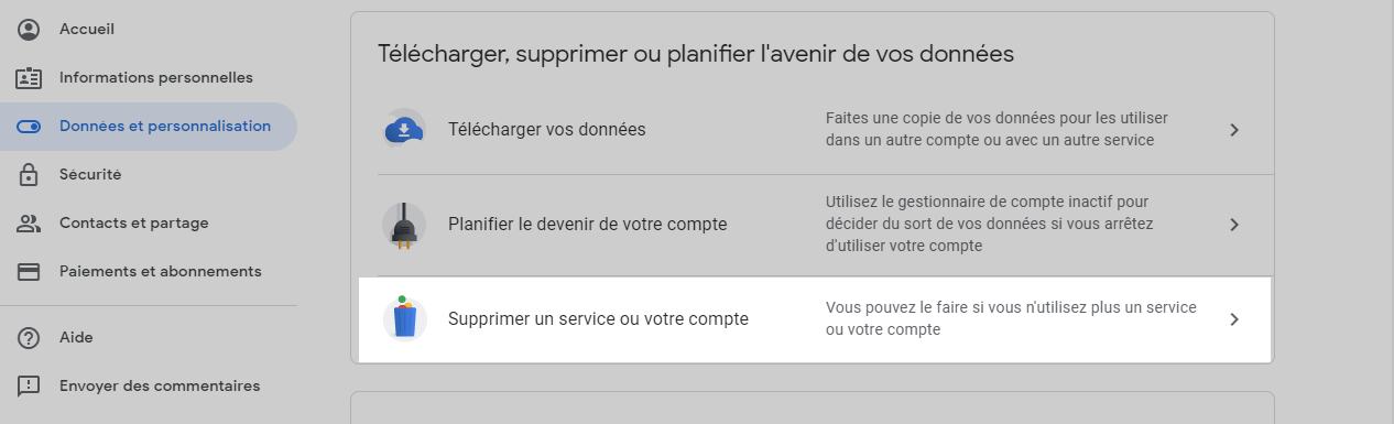 Dans le menu latéral de votre compte, sélectionnez Données et personnalisation. Faites défiler la page jusqu’à la section Télécharger, supprimer ou planifier vos données. - 4 – Supprimez un service Google